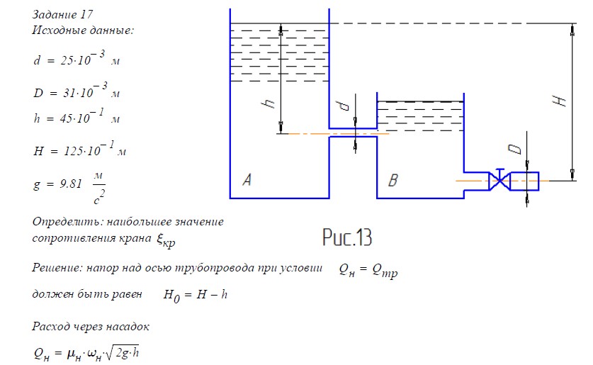17. Из бака А, в котором поддерживается постоянный уровень, вода протекает по цилиндрическому насадку диаметром d в бак В, из которого сливается в атмосферу по короткой трубе диаметром D, снабженной краном (рис.13). Определить наибольшее значение коэффициента сопротивления крана ξ, при котором истечение из насадка будет осуществляться в атмосферу. Потери на трение в трубе не учитывать.