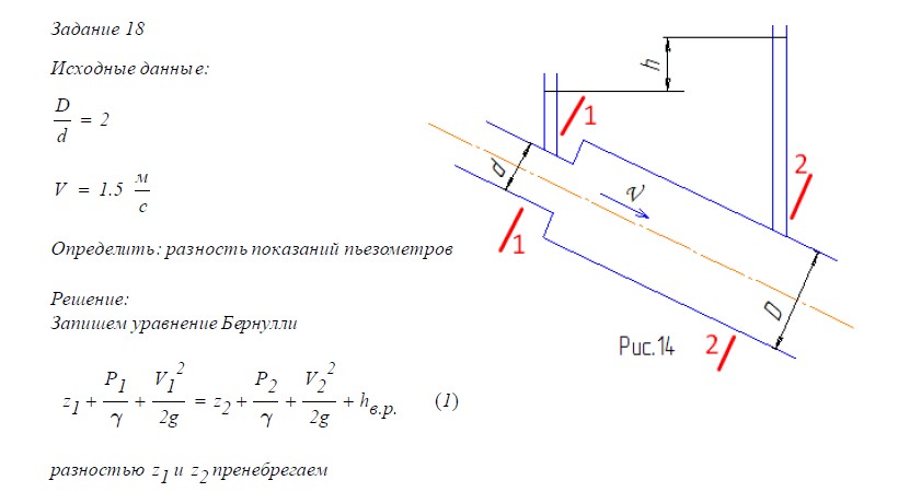 18. При внезапном расширении трубопровода скорость жидкости в трубе большего диаметра равна υ. Отношение диаметров труб D/d = 2 (рис.14). Определить h - разность…