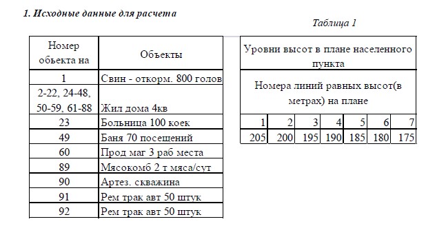 1) исходный вариант задания с планом населенного пункта, указанием коммунально-бытовых и производственных объектов, перечень и характеристику водопотребителей, уровни высот на плане населенного пункта;