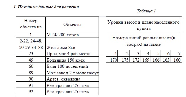 1) исходный вариант задания с планом населенного пункта, указанием коммунально-бытовых и производственных объектов, перечень и характеристику водопотребителей, уровни высот на плане населенного пункта;