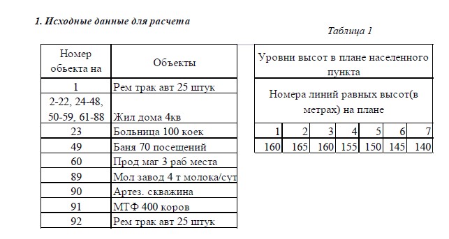 1) исходный вариант задания с планом населенного пункта, указанием коммунально-бытовых и производственных объектов, перечень и характеристику водопотребителей, уровни высот на плане населенного пункта;