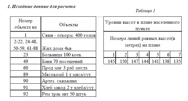 1) исходный вариант задания с планом населенного пункта, указанием коммунально-бытовых и производственных объектов, перечень и характеристику водопотребителей, уровни высот на плане населенного пункта;