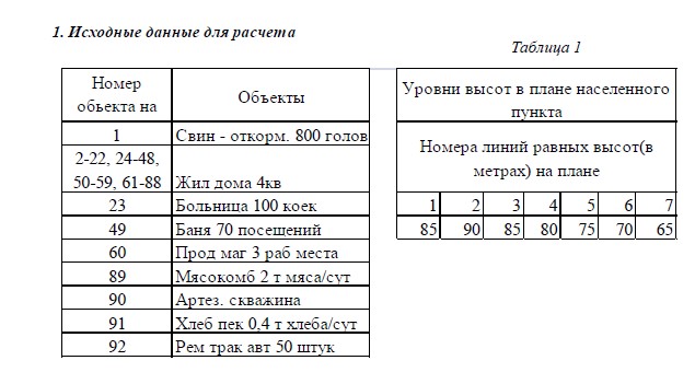 1) исходный вариант задания с планом населенного пункта, указанием коммунально-бытовых и производственных объектов, перечень и характеристику водопотребителей, уровни высот на плане населенного пункта;