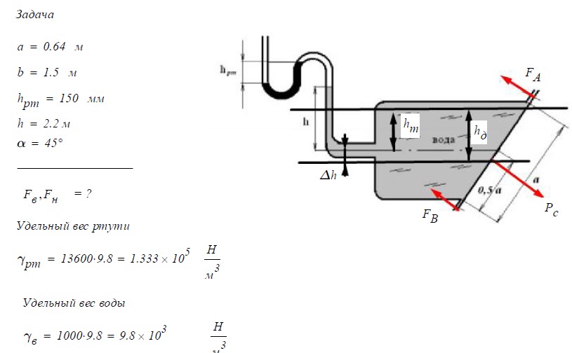 Задача 1.29. Определить силы, действующие на верхние FB и нижние FH болты крышки, которая имеет форму прямоугольника высотой а = 0,64 м и шириной b= 1,5 м. Показание ртутного вакуумметра hрт=150 мм, высота h = 2,2 м.