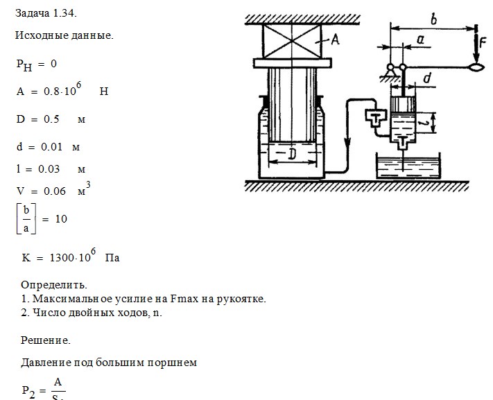 Задача 1.34. Давление в цилиндре гидравлического пресса повышается в результате нагнетания в него жидкости ручным поршневым насосом и сжатия ее в цилиндре. Определить число двойных ходов п поршня ручного насоса, необходимое для увеличения силы прессования детали А от 0 до 0,8 МН, если диаметры поршней: D = 500 мм, d = 10 мм; ход поршня ручного насоса 30 мм; объемный модуль упругости жидкости К=1300 мПа; объем жидкости в прессе V=60 л. Чему равно максимальное усилие F на рукоятке насоса при ходе нагнетания, если b/а=10?
