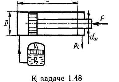 Задача 1.48. Определить объем гидроаккумулятора V = V1 V2, обеспечивающего выпуск штока гидроцилиндра против действия нагрузки F=45 кН. Диаметры: цилиндра D=120 мм;…