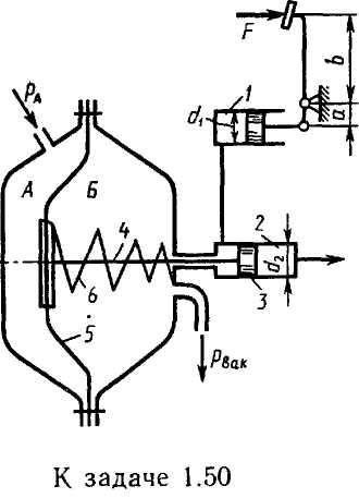 На рисунке показана принципиальная схема гидровакуумного усилителя гидропривода тормозов автомобиля. Давление жидкости, создаваемое в гидроцилиндре 1 благодаря нажатию на ножную педаль с силой F, передается в левую полость тормозного гидроцилиндра 2. Помимо давления жидкости на поршень 3 в том же направлении действует сила вдоль штока 4, связанного с диафрагмой 5. Последняя отделяет полость А, сообщающуюся с атмосферой, от полости Б, где устанавливается вакуум благодаря соединению ее со всасывающим коллектором двигателя при нажатии на педаль. Пружина 6 при этом действует на диафрагму справа налево с силой Fnp. Определить давление жидкости, подаваемой из правой полости гидроцилиндра 2 к колесным тормозным цилиндрам. Принять: усилие педали F = 200 H; сила пружины 6 Fnp = 20 Н; давление в полости Б рВАК = 0,06 МПа; диаметры: диафрагмы 5 D=100 мм, гидроцилиндра 1 d1 = 25 мм и гидроцилиндра 2 d2 = 20 мм; отношение плеч b/а = 5. Площадью сечения штока 4 пренебречь.