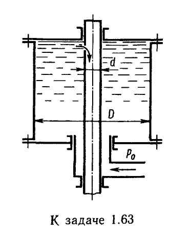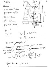Задача 1.63. Ротор центрифуги, включенной в систему смазки двигателя внутреннего сгорания для очистки масла, представляет собой полый цилиндр, заполненный маслом и вращающийся с частотой п = 7000 об/мин (рм = 900 кг/м3). Определить давление р масла на внутренней боковой поверхности ротора и силу давления F, действующую на крышку ротора, если диаметры D=140 MM, d = 30 мм. Масло подводится к центрифуге под давлением ро = 0,5 МПа.