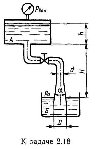 Задача 2.18. Вода перетекает из бака Л в резервуар Б по трубе длиной l = 2,5 м и диаметром d = 25 мм, на которой установлены вентиль (3,5) и диффузор с углом а= 8° и диаметром выходного отверстия D = 75 мм. Показание мановакуумметра рвак=10 кПа; высота H= 2,5 м, h = 2 м. Определить расход Q с учетом всех местных сопротивлений и трения по длине (0,03). Вход в трубу без закруглений, радиус кривизны колен R = 25 мм. Взаимным влиянием сопротивлений пренебречь.