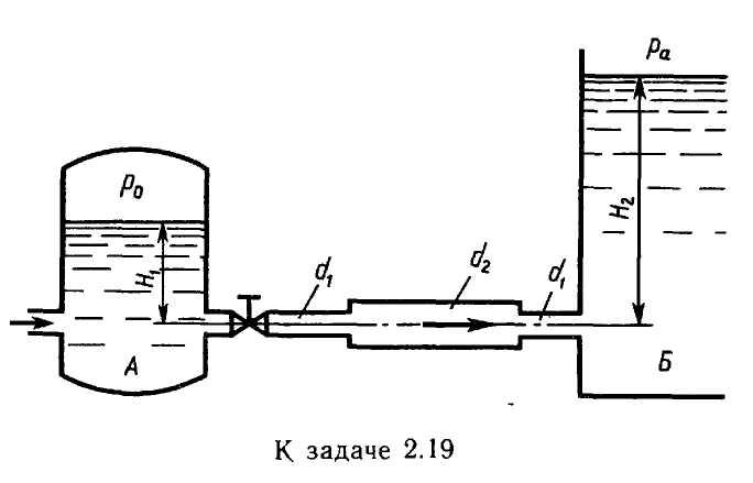 Задача 2.19. Вода перетекает из напорного бака A в резервуар Б через вентиль с коэффициентом сопротивления 3 по трубе. Диаметры: d1 = 40 мм; d2 = 60 мм. Считая режим течения турбулентным и пренебрегая потерями на трение по длине, определить расход. Учесть потери напора при внезапных сужениях и расширениях. Высоты: H1 = l м, H2 = 2 м; избыточное давление в напорном баке ро = 0,15 МПа.