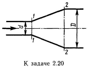 Задача 2.20. Пренебрегая потерями напора, определить степень расширения диффузора n = (D/d)2, при котором давление в сечении 2—2 возрастет в два раза по сравнению с…