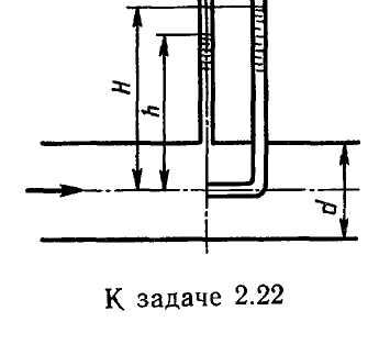 Задача 2.22. По длинной трубе диаметром d = 50 мм протекает жидкость (v = 2 Ст; р = 900 кг/м3). Определить расход жидкости и давление в сечении, где установлены пьезометр (h = 60 см) и трубка Пито (H = 80 см).