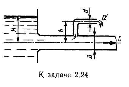 Задача 2.24. Вода течет по трубе диаметром D = 20 мм, имеющей отвод (d = 8 мм). Пренебрегая потерями напора, определить расход жидкости в отводе Q', если расход в основной трубе Q= 1,2 л/с; высоты H= 2 м, h = 0,5 м. Режим течения считать турбулентным.