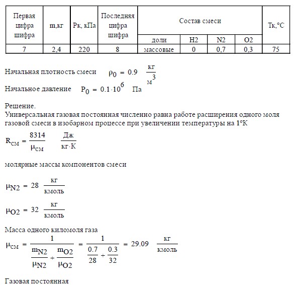 Газовая смесь массой m , имеющая начальную плотность 0,9 кг/м³, в ходе политропного процесса сжимается от давления 0,1 МПа до давления Рк. При этом ее температура достигает значения Тк.