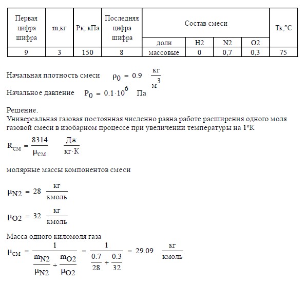 Газовая смесь массой m , имеющая начальную плотность 0,9 кг/м³, в ходе политропного процесса сжимается от давления 0,1 МПа до давления Рк. При этом ее температура достигает значения Тк.