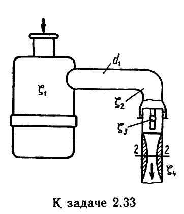 Задача 2.33. Воздух засасывается двигателем из атмосферы, проходит через воздухоочиститель и затем по трубе диаметром d1 = 50 мм подается к карбюратору. Плотность воздуха р = 1,28 кг/м3. Определить разрежение в горловине диффузора диаметром d2 = 25 мм (сечение 2—2) при расходе воздуха Q = 0,05 м3/с. Принять следующие коэффициенты сопротивления: воздухоочистителя 5; колена 1; воздушной заслонки 0,5 (отнесены к скорости в трубе); сопла 0,05 (отнесен к скорости в горловине диффузора).