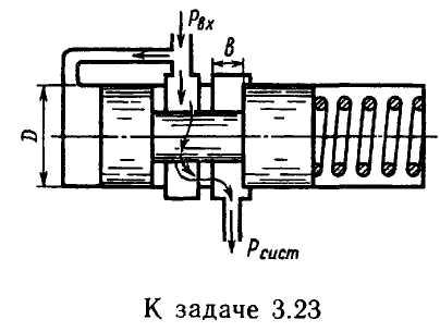 Задача 3.23. Определить ширину проходного отверстия b и жесткость пружины с переливного клапана, который начинает перекрывать проходное отверстие при падении давления на входе рвх до 10 МПа и полностью перекрывает его при Pвх = 9 МПа. Перепад давления на агрегате р = PВХ - Рсиcт при полностью открытом золотнике и расходе Q = 1,5 л/с должен быть 0,3 МПа. Проходное отверстие выполнено в виде кольцевой щели, диаметр золотника D = 12 мм, коэффициент расхода окна золотника 0,62; р = 850 кг/м3