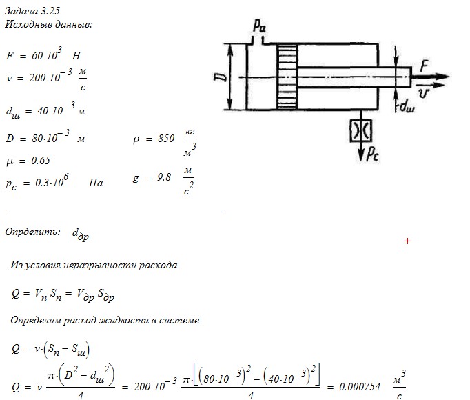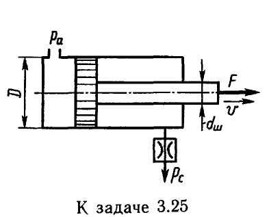 Задача 3.25. Определить диаметр отверстия дросселя, установленного на сливе из гидроцилиндра, при условии движения штока цилиндра под действием внешней нагрузки F = 60 кН со скоростью v = 200 мм/с. Диаметры: штока dш = 40 мм, цилиндра D = 80 мм, коэффициент расхода дросселя 0,65, плотность жидкости р = 850 кг/м3, давление на сливе рс = 0,3 МПа.