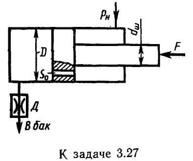 Задача 3.27. Жидкость с плотностью р = 850 кг/м3 подается от насоса в гидроцилиндр, а затем через отверстие в поршне площадью S0 = 5 мм2 и гидродроссель Д в бак (рб = 0).