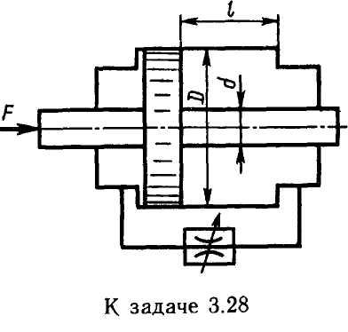 Задача 3.28. Правая и левая полости цилиндра гидротормоза, имеющего диаметр поршня D = 140 мм и диаметр штока dш = 60 мм, сообщаются между собой через дроссель с площадью проходного сечения Sдр = 20 мм2 и коэффициентом расхода 0,65. Определить время, за которое поршень переместится на величину хода l = 350 мм под действием силы F= 15 кН, плотность жидкости р = 900 кг/м3.