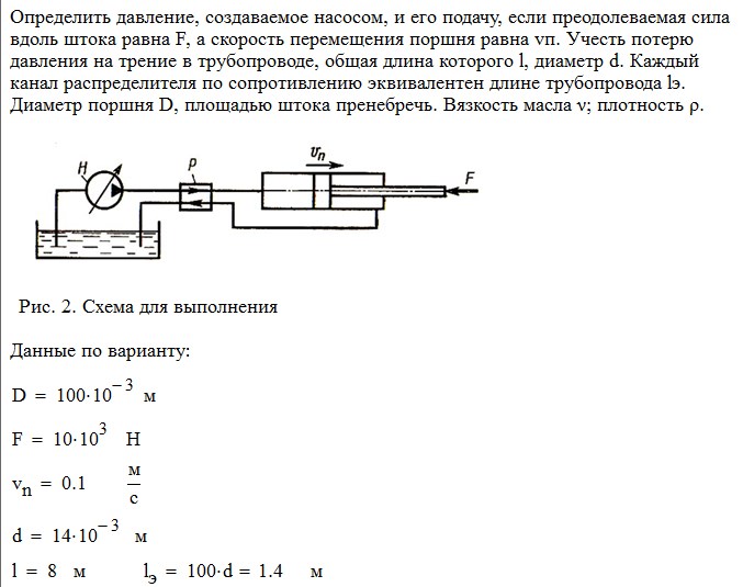 Задача 6.4. Определить давление, создаваемое насосом, и его подачу, если преодолеваемая сила вдоль штока F = 10 кН, а скорость перемещения поршня Vп = 0,1 м/с. Учесть потерю давления на трение в трубопроводе, общая длина которого l = 8 м; диаметр d=14 мм. Каждый канал распределителя по сопротивлению эквивалентен длине трубопровода lЭ=100d. Диаметр поршня D=100 мм, площадью штока пренебречь. Вязкость масла v=l Ст; плотность р = 900 кг/м3.