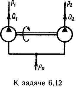 Задача 6.12. Объемный делитель потока состоит из двух одинаковых роторных гидромашин, соединенных общим валом. Определить давление перед делителем pо, если давление p1 = 10 МПа; p2=1 МПа; механические к.п.д. гидромашин 0,95. Найти соотношение расходов в параллельных ветвях Q1 и Q2, которое будет отлично от единицы из-за наличия объемных потерь в гидромашинах. Принять, что их объемные к.п.д. линейно зависят от перепадов давления и при 10МПа равны 0,9.