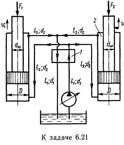 Задача 6.21. В гидравлической системе автомобиля масло подается насосом в силовые гидроцилиндры подъемного устройства. Определить скорости перемещения поршней vn1 и vn2…