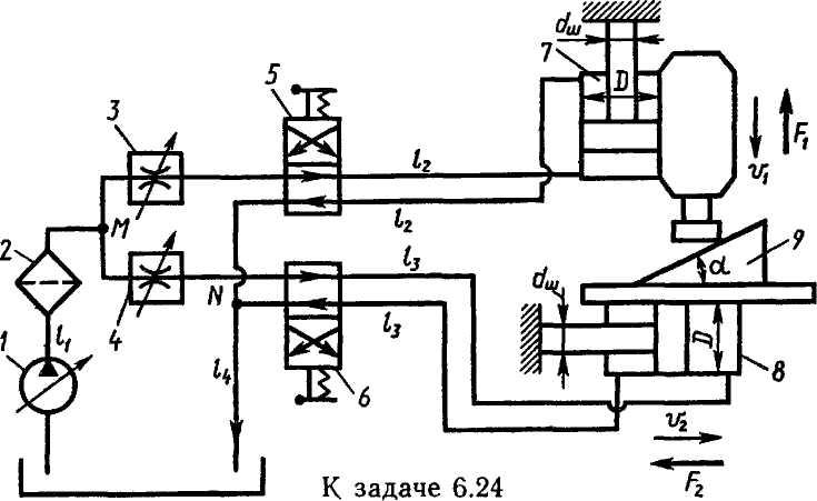 Задача 6.24. В системе гидропривода фрезерного станка насосом 1 через фильтр 2, регулируемые дроссели 3 и 4 и распределители 5 и 6 подается масло (р = 900 кг/м3) к гидроцилиндрам 7 и 8, которые осуществляют подачу фрезерной головки и стола. Угол а обработки детали 9 определяется соотношением скоростей
