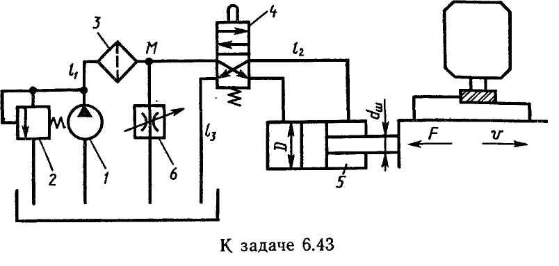 Задача 6.43. Гидропривод стола фрезерного станка состоит из насоса 1, предохранительного клапана 2, фильтра 3, гидрораспределителя 4, гидроцилиндра 5 и гидродросселя 6. Скорость движения стола регулируется за счет изменения площади проходного сечения дросселя 6.
