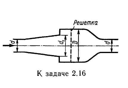 Задача 2.16. Сравнить коэффициенты сопротивления расходомера Вентури, данные которого приведены в предыдущей задаче, и специального расходомера, показанного на рисунке. Последний состоит из диффузора (0,15), расширяющего поток до диаметра d1 = 1,4d, внезапного расширения широкой части до диаметра D = 2,5d, в которой установлена решетка для выравнивания скоростей (0,05) и сопла (0,05). Коэффициенты отнесены к скорости в трубе диаметров d.