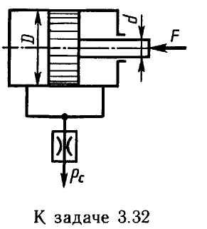 Задача 3.32. Считая жидкость несжимаемой, определить скорость движения поршня под действием силы F= 10 кН на штоке, диаметр поршня D = 80 мм, диаметр штока d = 30 мм…