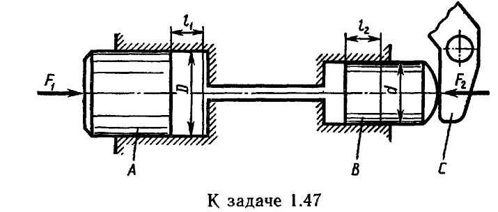 Задача 1.47. В системе дистанционного гидроуправления необходимо обеспечить ход h поршня В равным ходу l1 поршня А, т. е. l1 = l2 = l = 32 мм. Поршень В диаметром d = 20 мм должен действовать на рычаг С с силой F2 = 8 кН. Цилиндры и трубопровод заполнены маслом с модулем упругости К= 1400 МПа. Объем масла, залитого при атмосферном давлении, V=700 см3. Определить диаметр D поршня A и силу F1, приложенную к поршню А. Упругостью стенок цилиндров и трубок, а также силами трения поршней о стенки цилиндров пренебречь.