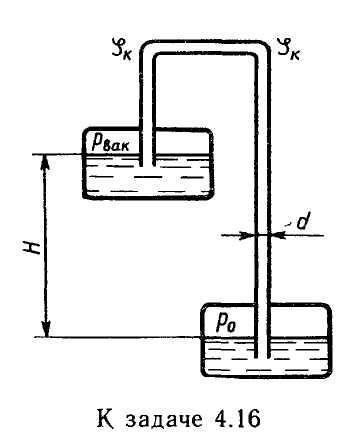 Задача 4.16. Труба, соединяющая два бака, заполнена жидкостью с вязкостью v = 0,01 Ст и плотностью р = 1000 кг/м3. Определить, при какой высоте H жидкость будет двигаться из верхнего бака в нижний с расходом Q = 0,05 л/с, а при какой высоте H будет двигаться в обратном направлении с тем же расходом, если длина трубы l = 2,5 м; ее диаметр d = 8 мм; коэффициент сопротивления каждого колена 0,5; избыточное давление в нижнем баке ро=7 кПа; вакуум в верхнем баке рвак = 3 кПа. Трубу считать гидравлически гладкой.