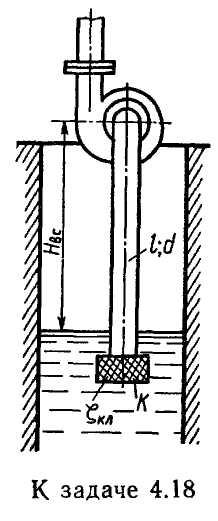 Задача 4.18. Определить абсолютное давление воды перед входом в центробежный насос при подаче Q = 0,628 л/с и высоте всасывания Hвс = 5 м. Всасывающую трубу, длина которой l = 8 м, диаметр d=20 мм, считать гидравлически гладкой. Учесть сопротивление приемного клапана К с фильтрующей сеткой £Кл = 3. Вязкость воды v = 0,01 Ст. Атмосферное давление - 750 мм рт. ст.
