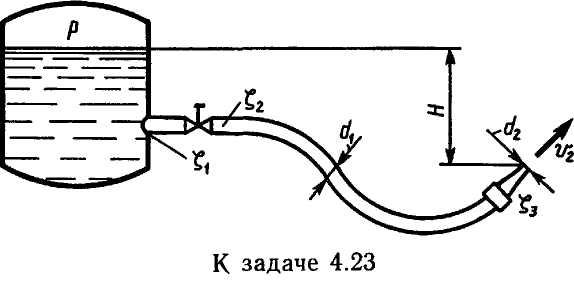 Задача 4.23. Определить давление в напорном баке р, необходимое для получения скорости истечения из брандспойта V2 = 20 м/с. Длина шланга l = 20 м; диаметр d1 = 20 мм; диаметр выходного отверстия брандспойта d2 = 10 мм. Высота уровня воды в баке над отверстием брандспойта H = 5 м. Учесть местные гидравлические сопротивления при входе в трубу - 0,5; в кране - 3,5; в брандспойте - 0,1, который отнесен к скорости v2. Шланг считать гидравлически гладким. Вязкость воды v = 0,01 Ст.
