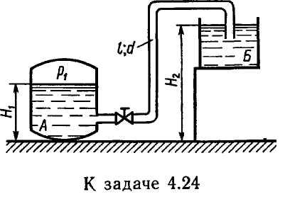 Задача 4.24. Вода перетекает из бака А в резервуар Б по трубе диаметром d = 25 мм, длиной l=10 м. Определить расход воды Q, если избыточное давление в баке p1 = 200 кПа;…