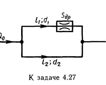 Задача 4.27. Определить, при каком проходном сечении дросселя расходы в параллельных трубопроводах будут одинаковыми, если длины трубопроводов l1 = 5 м и l2 = 10 м; их…