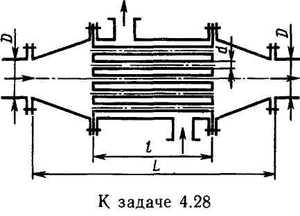 Задача 4.28. На трубопроводе диаметром D = 400 мм, подводящем воду к ТЭЦ, установлен трубчатый подогреватель воды. Сумма живых сечений трубок (d = 25 мм) сделана примерно равной площади сечения трубопровода; длина трубок l = 0,5 L; число трубок n = 256. Пренебрегая сопротивлением конусов и потерями на входе в трубки и на выходе из них, определить, во сколько раз сопротивление подогревателя больше сопротивления участка трубопровода диаметром D и длиной L, на место которого установлен подогреватель. Использовать формулу Блазиуса
