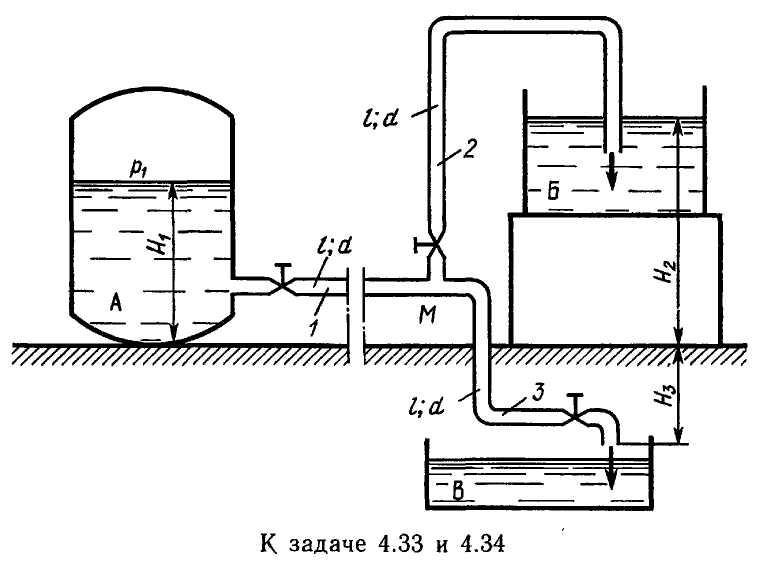 Задача 4.34. Предыдущую задачу решить в другой постановке, а именно: при всех тех же размерах и также значениях коэффициентов сопротивлений определить расход Qi на выходе из бака А, а также расходы воды Q2 и Qz, подаваемой в резервуары Б и В. Избыточное давление в баке А считать заданным и равным pi = 86,4 кПа.