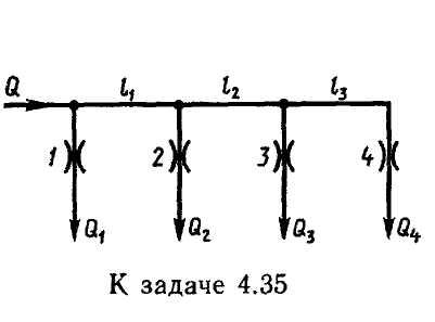 Задача 4.35. По трубопроводу длиной l = l1 l2 l3 движется жидкость, истекающая по пути следования через дроссели 1..4 в атмосферу. Движение жидкости в трубопроводе на…