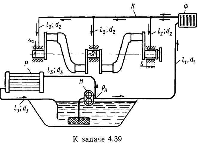 Задача 4.39. В двигателе внутреннего сгорания подача масла для смазки коренных подшипников коленчатого вала производится насосом Н по трубе размерами l1 = l м; d1 = 10 мм через фильтр Ф и распределительный канал К, от которого отходят три отводных канала размерами l2 = 250 мм; d2 = 4 мм к серединам подшипников. Часть подачи насоса по трубке размерами l3=1 м; d3 = 5 мм подается в радиатор р, из которого по такой же трубке сливается в картер. Определить давление насоса и расход масла через подшипники и радиатор (диаметр шейки коленчатого вала d0 = 50 мм, длина подшипника s = 60 мм). Зазор в подшипниках считать концентрическим и равным 6 = 0,1 мм. Влиянием вращения вала пренебречь. Сопротивление фильтра и радиатора принять эквивалентным сопротивлению трубок длиной lф = 100 d1 и lр= 1300 d3. Свойства масла: р=900 кг/м3; v = 0,3 Ст. Давление в распределительном канале считать постоянным по длине. Режим течения считать ламинарным. Характеристика насоса задана: