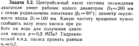 Задача 5.2. Центробежный насос системы охлаждения двигателя имеет рабочее колесо диаметром £2 = 200 мм с семью радиальными лопатками ( 90°); диаметр окружности входа D1 = 100 мм. Какую частоту вращения нужносооощить валу этого насоса при работе на воде для получения давле ния насоса р = 0,2 МПа? Гидравли ческий к.п.д. насоса принять равным 0,7.