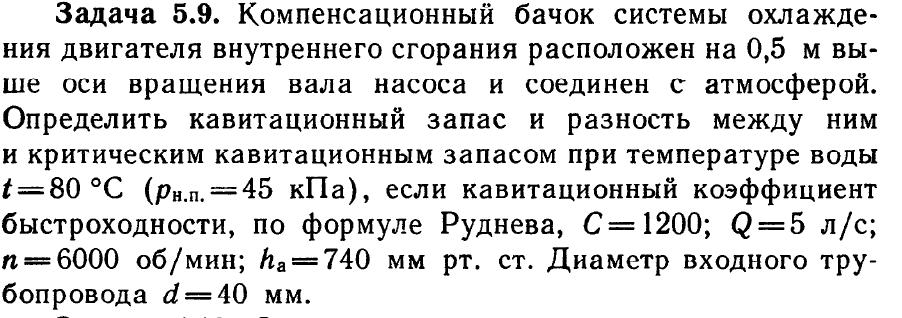 Задача 5.9. Компенсационный бачок системы охлаждения двигателя внутреннего сгорания расположен на 0,5 м выше оси вращения вала насоса и соединен с атмосферой. Определить кавитационный запас и разность между ним и критическим кавитационным запасом при температуре воды t = 80 °C (рНП1 = 45 кПа), если кавитационный коэффициент быстроходности, по формуле Руднева, С=1200; Q = 5 л/с; n = 6000 об/мин; hа = 740 мм рт. ст. Диаметр входного трубопровода d = 40 мм.