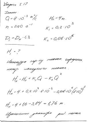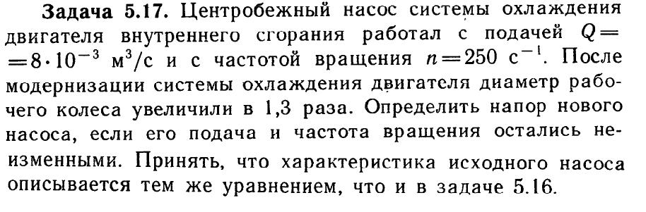Задача 5.17. Центробежный насос системы охлаждения двигателя внутреннего сгорания работал с подачей Q = 8• 10-3 м3/с и с частотой вращения n = 250 . После модернизации системы охлаждения двигателя диаметр рабочего колеса увеличили в 1,3 раза. Определить напор нового насоса, если его подача и частота вращения остались неизменными. Принять, что характеристика исходного насоса описывается тем же уравнением, что и в задаче 5.16
