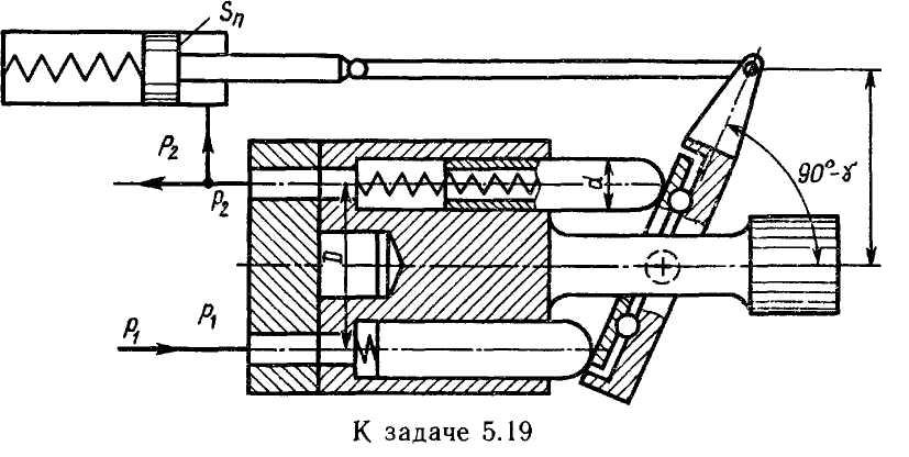 Задача 5.19. Аксиальный роторно-поршневой насос с наклонным диском снабжен автоматом-ограничителем давления (на рисунке дана его упрощенная схема), к которому подводится жидкость под давлением P2 в напорной линии. Ограничение давления и уменьшение подачи происходят благодаря повороту диска на меньший угол у, что осуществляется воздействием поршня автомата на диск. Требуется рассчитать и построить характеристику насоса в системе координат PH = F(Q) ПО следующим данным: диаметр поршней d=12 мм; число поршней z = 7; диаметр окружности, на которой расположены оси поршней в роторе, D = 70 мм; максимальный угол наклона диска, при котором рн = 0 и Q = Qmax, у = 30°; плечо силы давления жидкости на поршень автомата L = 55 мм; сила пружины автомата при уmах Fпр0 = 200 Н; жесткость этой пружины с =1,5 Н/мм; активная площадь поршня автомата Sn = 0,2 см2; частота вращения ротора насоса n = 1450 об/мин. Объемный к.п.д. насоса при рн = 15 МПа принять равным 0,94. При расчете момент, действующий на диск со стороны поршней насоса, не учитывать.