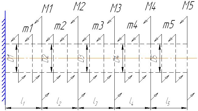 Задан ступенчатый вал, нагруженный внешними сосредоточенными (m) и распределенными крутящими (M) моментами.