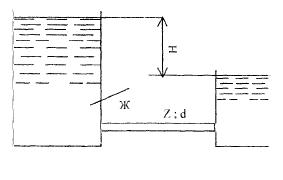 Задача 14. Определить длину трубы l, при которой расход жидкости из бака будет в два раза меньше, чем через отверстие того же диаметра d. Напор над отверстием равен Н. Коэффициент гидравлического трения в трубе принять λ = 0,025 (рис. 12).