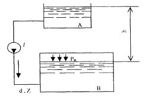 Задача 24. Вода перекачивается насосом I из открытого бака в расположенный ниже резервуар B, где поддерживается постоянное давление рB, по трубопроводу общей длиной l и диаметром d. Разность уровней воды в баках h (рис.17). Определить напор, создаваемый насосом для подачи в бак В расхода воды Q. Принять суммарный коэффициент местных сопротивлений ξ = 6,5. Эквивалентная шероховатость стенок трубопровода kЭ =0,15 мм.